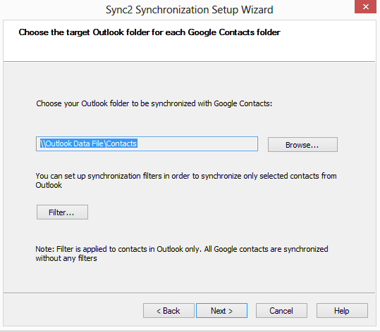 By default, all Contacts from your selected folder will be synchronized with Google Contacts and vice versa. By clicking the "Filter…" button you can set the synchronization filters for the Contacts that are in sync with Google Contacts from the selected Outlook folder.