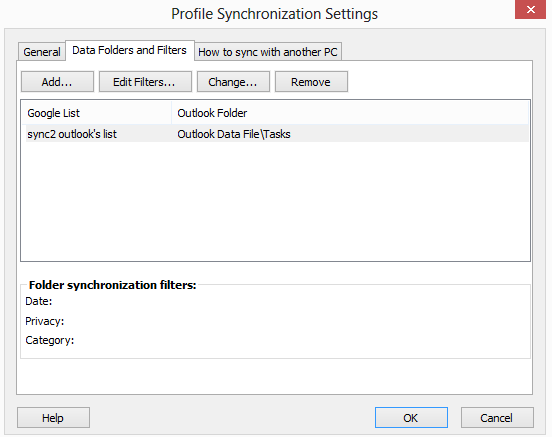 Data Folders and Filters (Synchronizing Microsoft Outlook with Google Task lists): here you can see the synchronized folders, Google Task lists and their corresponding filters. Add, remove and change assignment of corresponding folders within the selected Profile.
