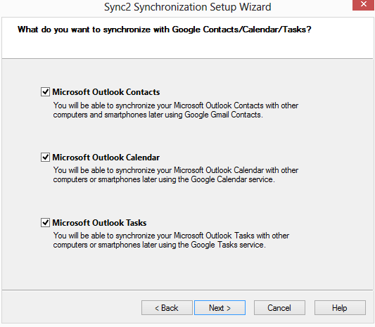 This step prompts you to check the Google services you want to synchronize with your Outlook.