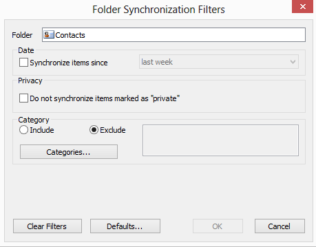 Synchronization filters can be applied to each folder and their default settings. The set of options depends on the Microsoft Outlook folder type. Filters will allow you to synchronize the only Outlook data that actually needs to be synchronized. Default filters will automatically apply during the first synchronization, and you will only able to adjust their settings from advanced configuration of the profile setup wizard.